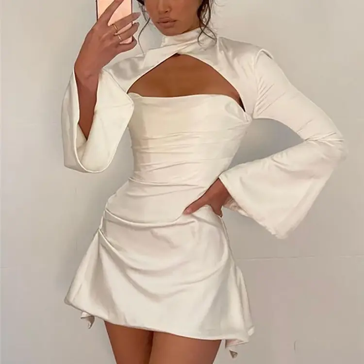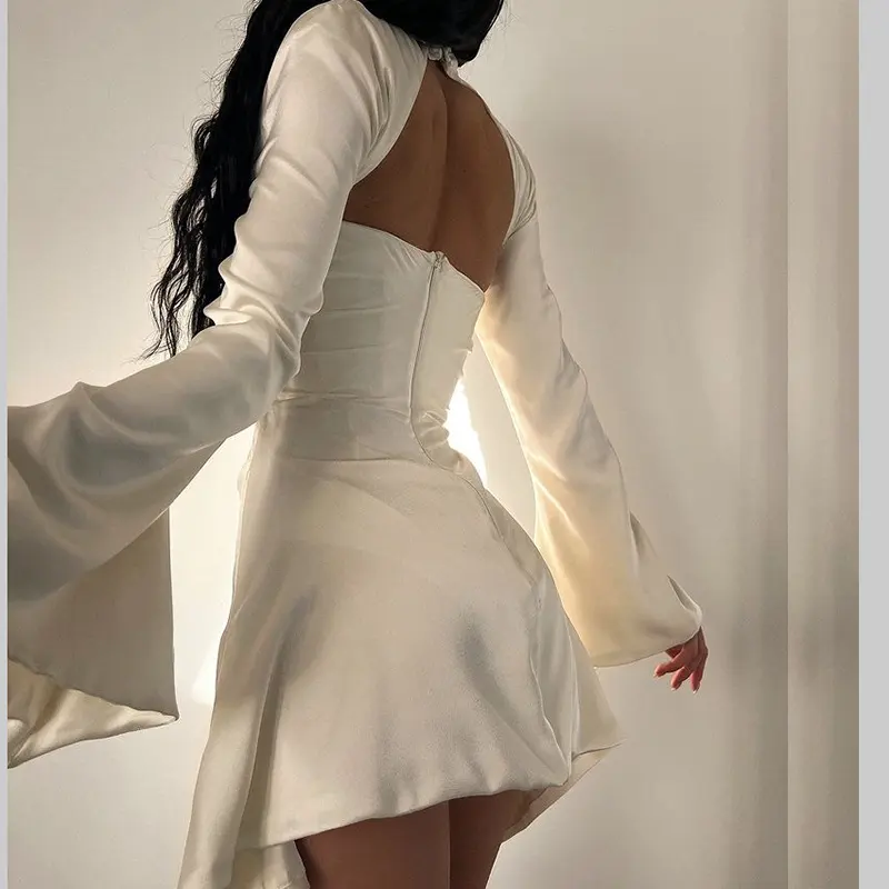 2022 Customized Wholesale Autumn Casual Hot Sale Women's Dresses Satin Waist Flared Sleeve Hollow A-line Woman Sexy Dress