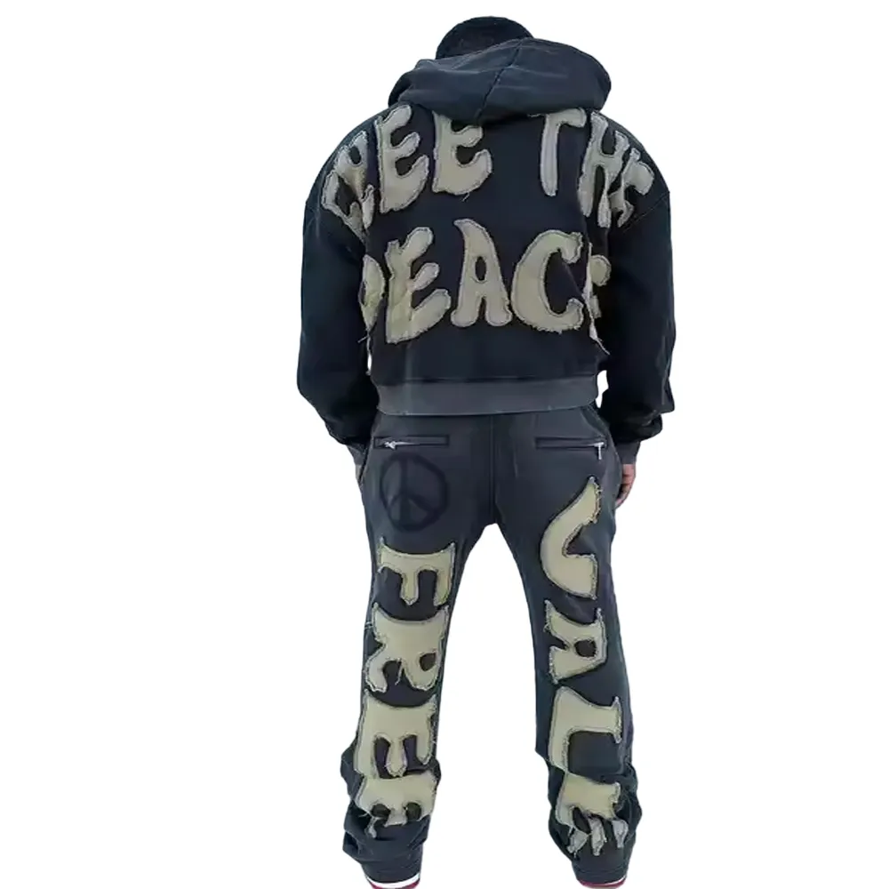 2025 Men's Custom Plus Size Acid Wash Winter Tracksuit Set Heavyweight DTG Silk Screen Printed Hoodie Rhinestone Technique Solid