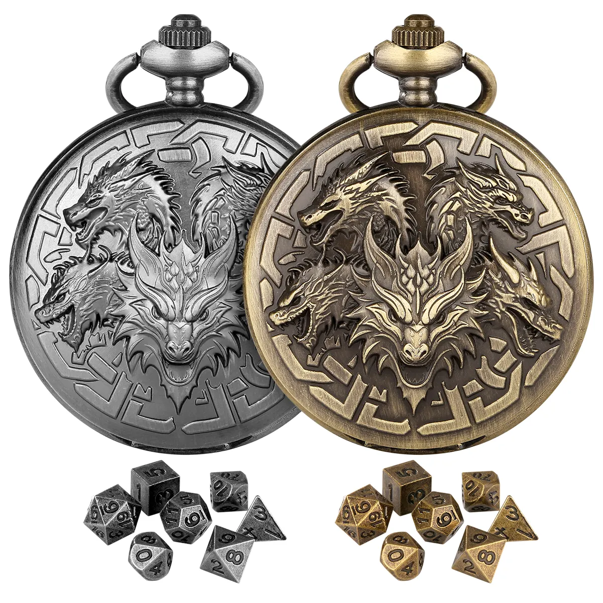 3D Five-Headed Dragon Retro RPG Pocket Watch Shell 7pcs Dungeons and Dragons DND Dice Set with Necklace