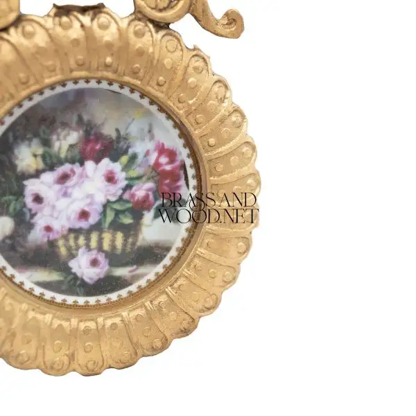 antique brass decorative round frame with porcelain painting of floral basket vintage aged artwork classical luxury home decor