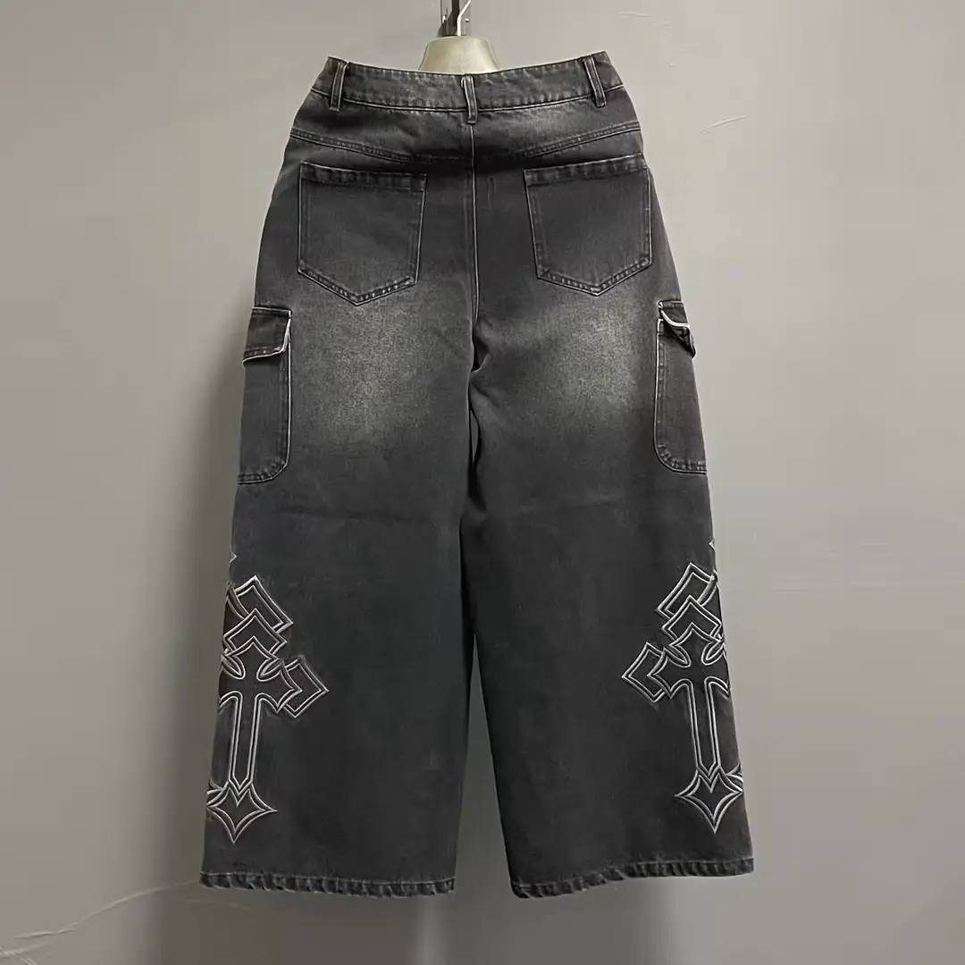 Black Wide Leg Denim Jeans Cotton Knitted Fabric Mid Waist Stonewashed Embroidered Hip Hop Streetwear Style 3D Design