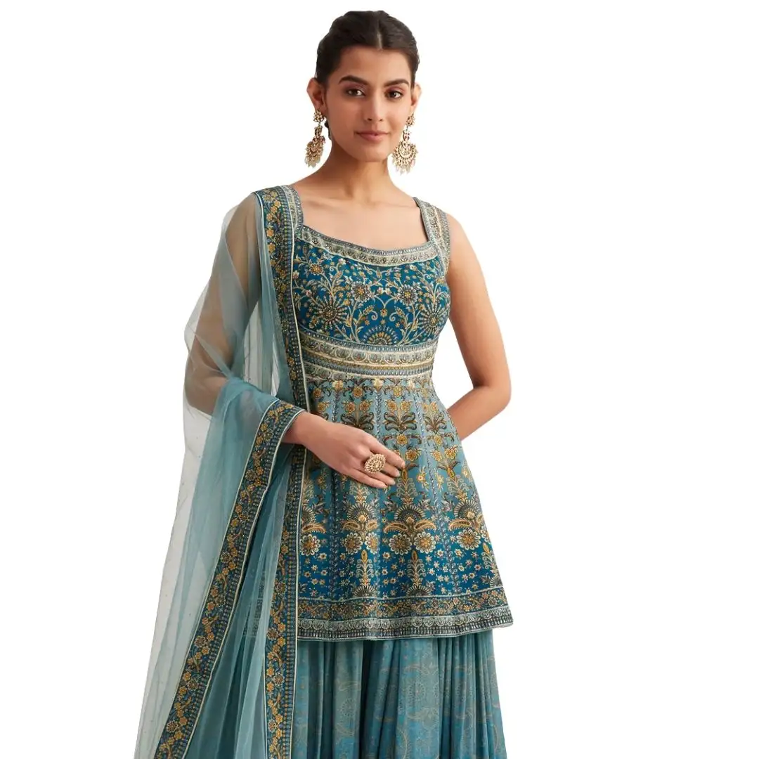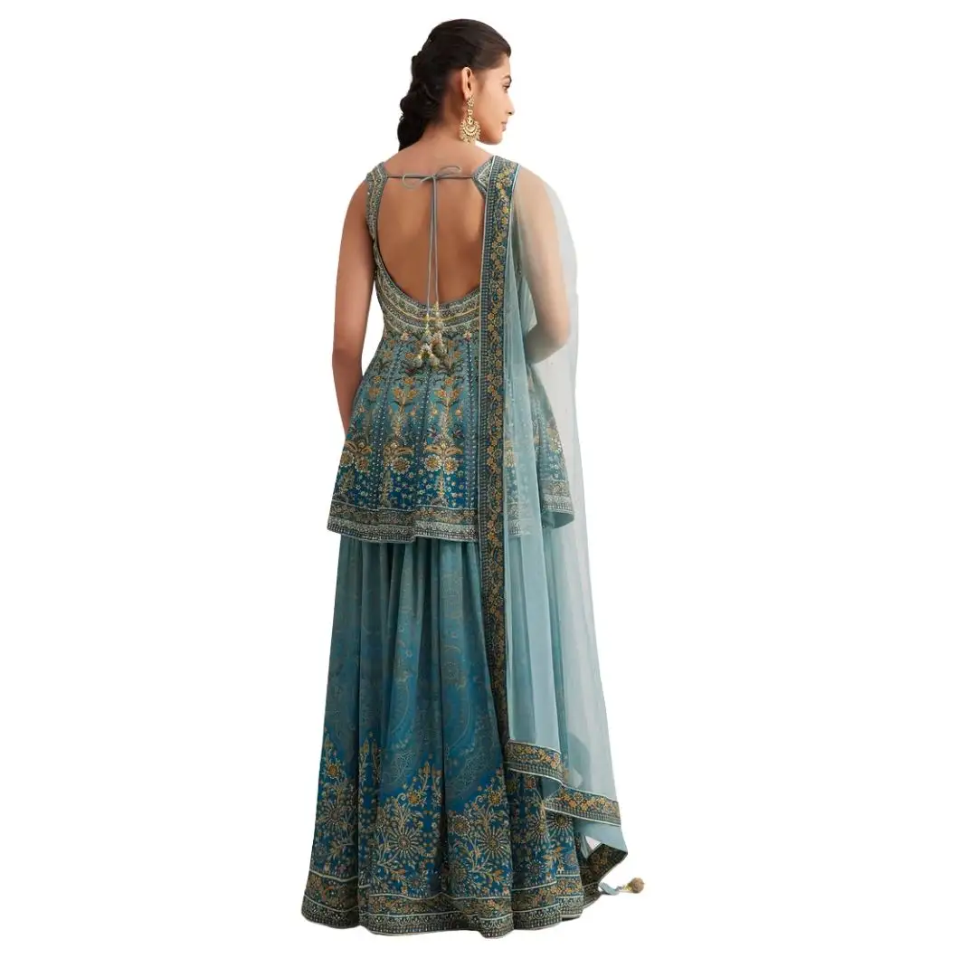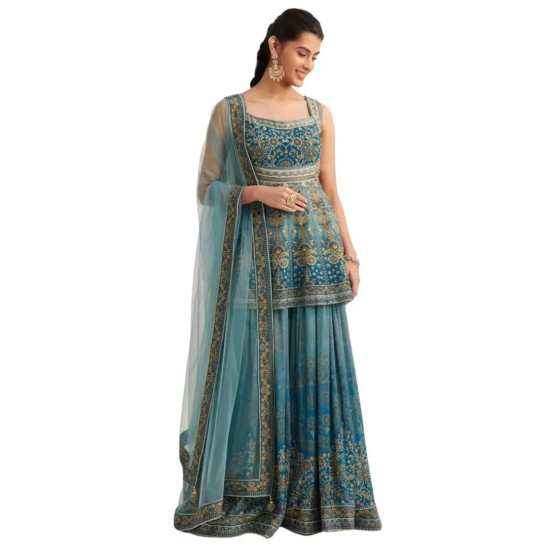 Blue Ombre Crepe Kurta Palazzo Set With Embellished Net Dupatta Wholesale Women Ethnic OEM Clothing Factory Supplier Outfit