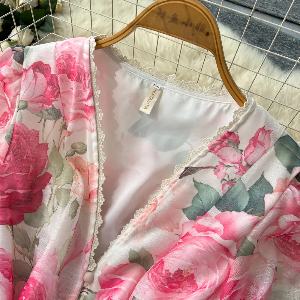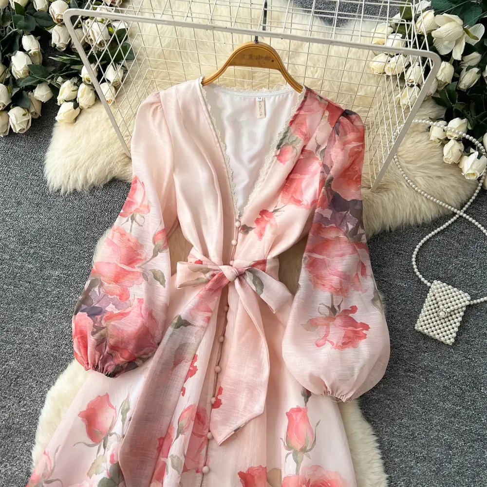 Clothes Women Dress Women's Floral V-Neck Sleeve Dress Waist-Defining A-Line Office Dress Wholesa Casual Dresses For Women