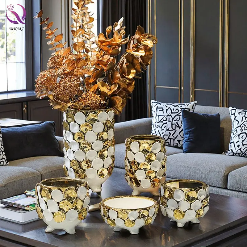 Creative Handpainted Round Decal Desktop Vase Light Luxury Gold White Ceramic Vase for Wedding Event Living Room Home Decor