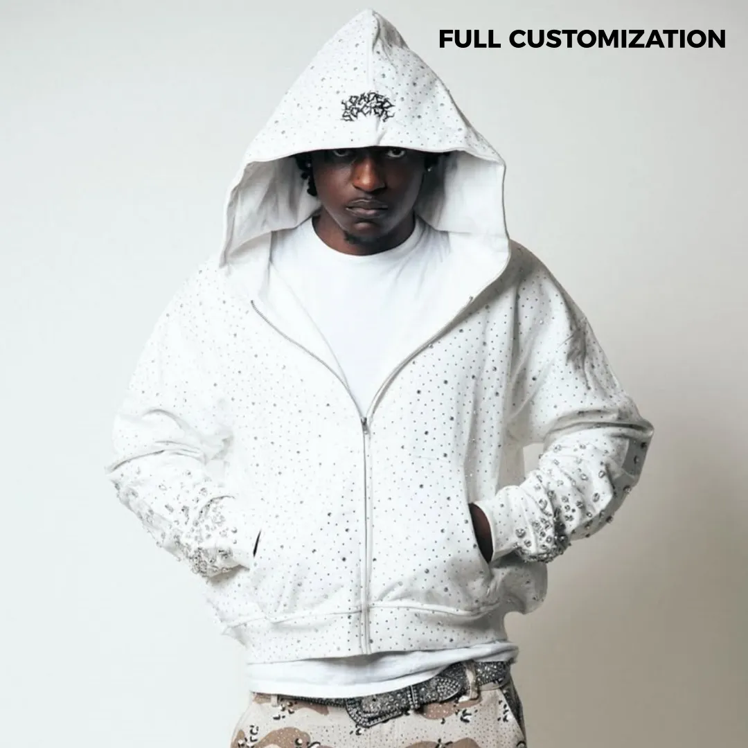 Custom Distressed Boxy Fit Zip up Hoodies Personalized Heavyweight Streetwear Hip Hop Rhinestone Unisex Hoodies for Men