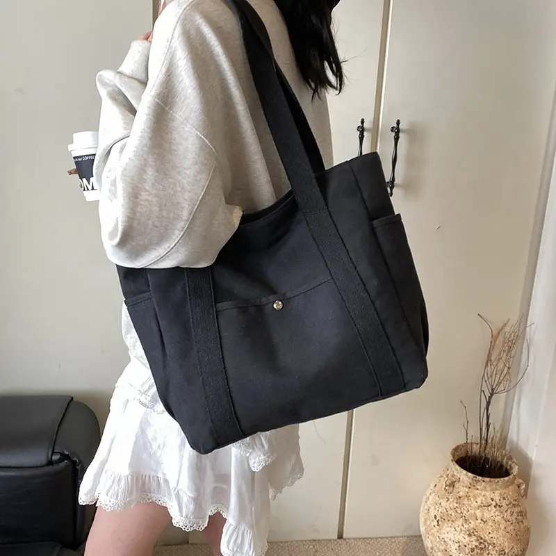 Custom Logo Size Printed Eco Friendly Canvas Shopping Bag with Multiple Pocket Cotton Plain Tote Bags for Women Shoulder Grocery