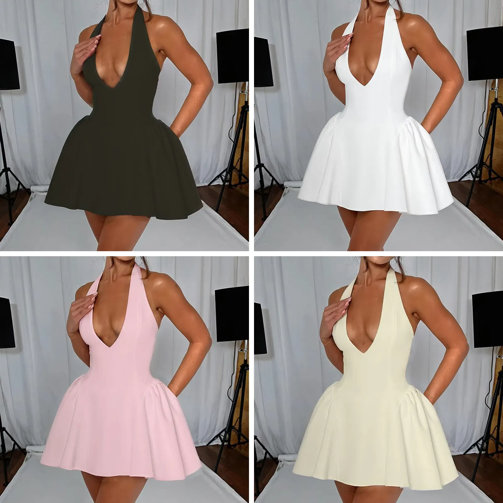 Custom Manufacturer Wholesale Summer Sexy Casual Luxury Fashion Ladies Halter Deep V Neck Backless Mini Dress Women