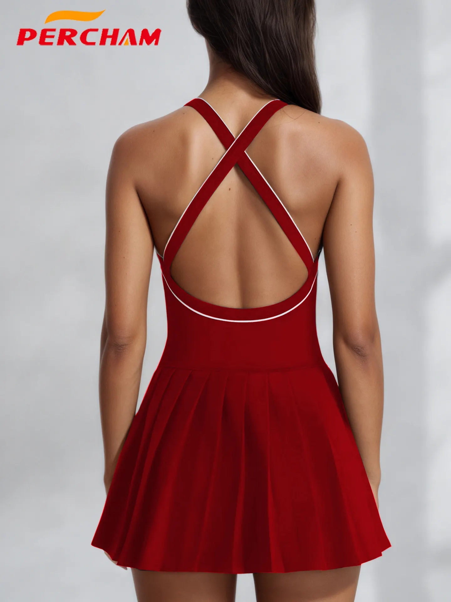 Custom Tennis Sport Dress Contrast Color Open Back Pleated Golf Dress Women Gym Fitness Wear with Removable Cups High Elasticity