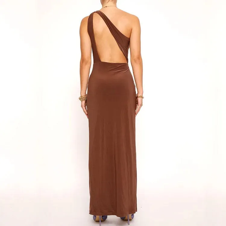 Female Casual Modest Vintage Slim Dress Solid Color Asymmetric Shoulder Backless Halter Evening Party Dresses Spring Plain Dyed