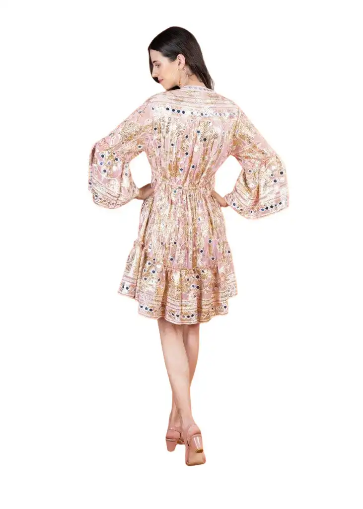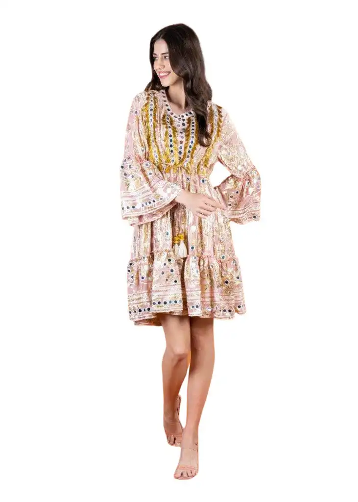 High Fashion Embroidered Handmade Boho Knitted Designer Ruffle Three Quarter Sleeve Women Party Dress