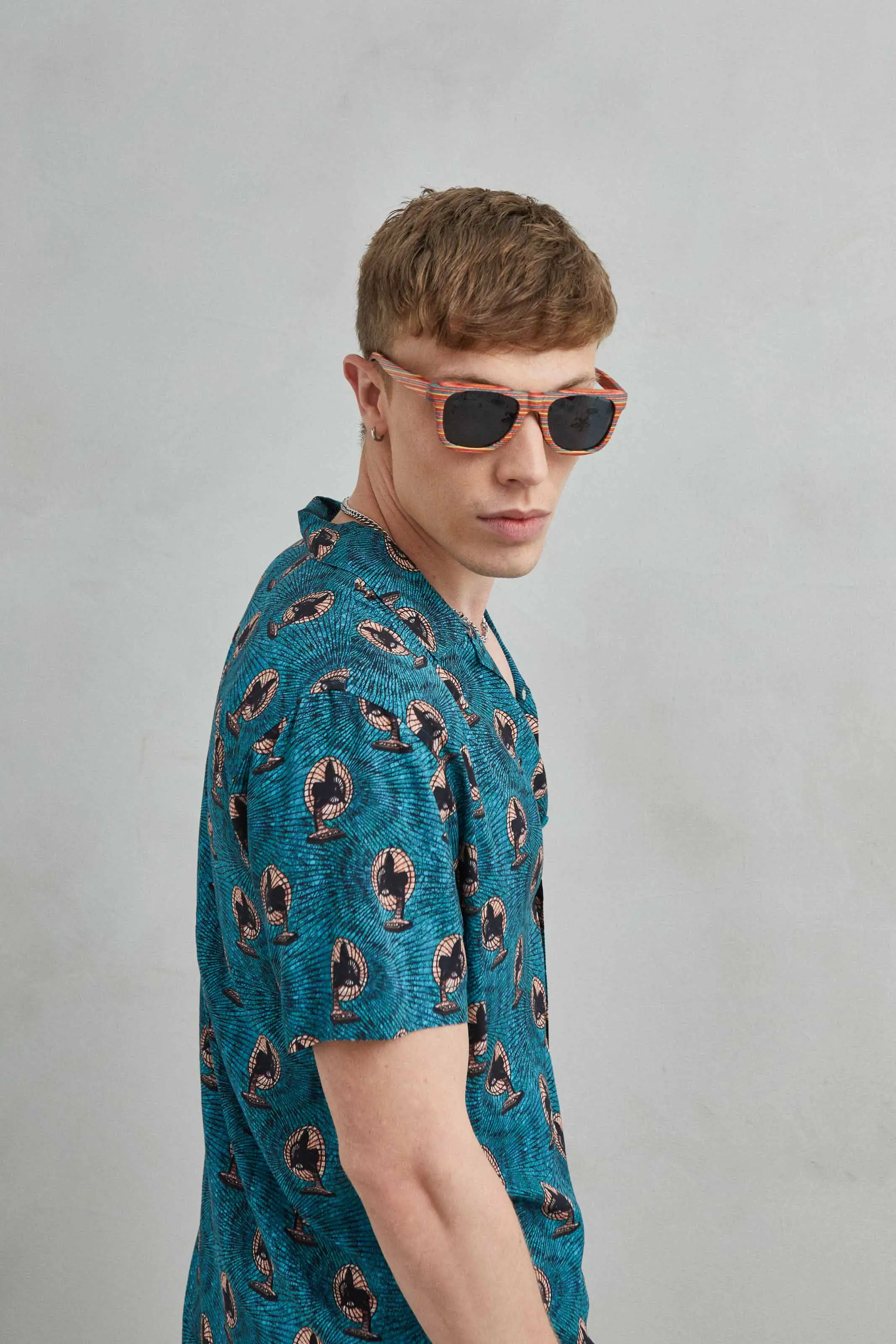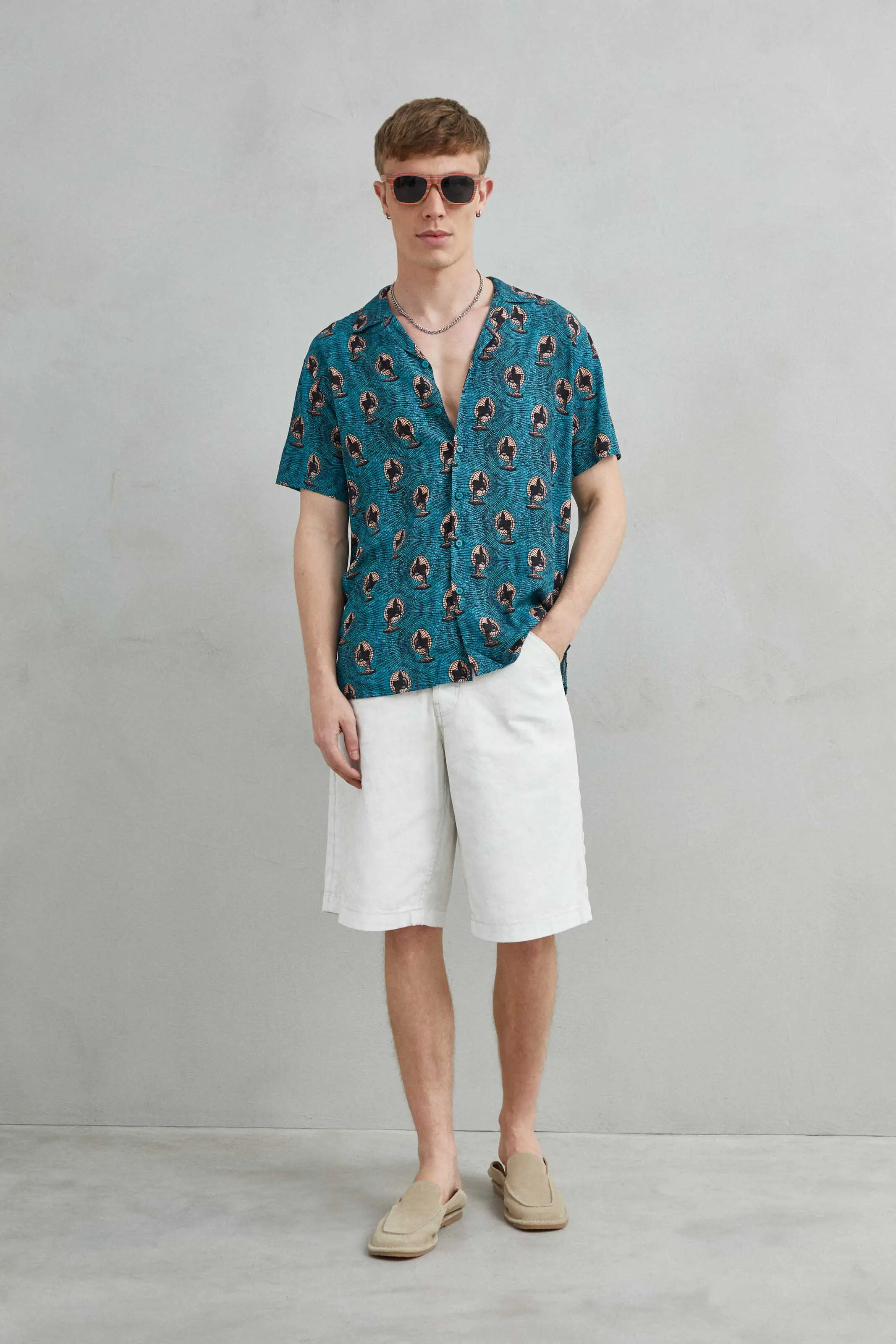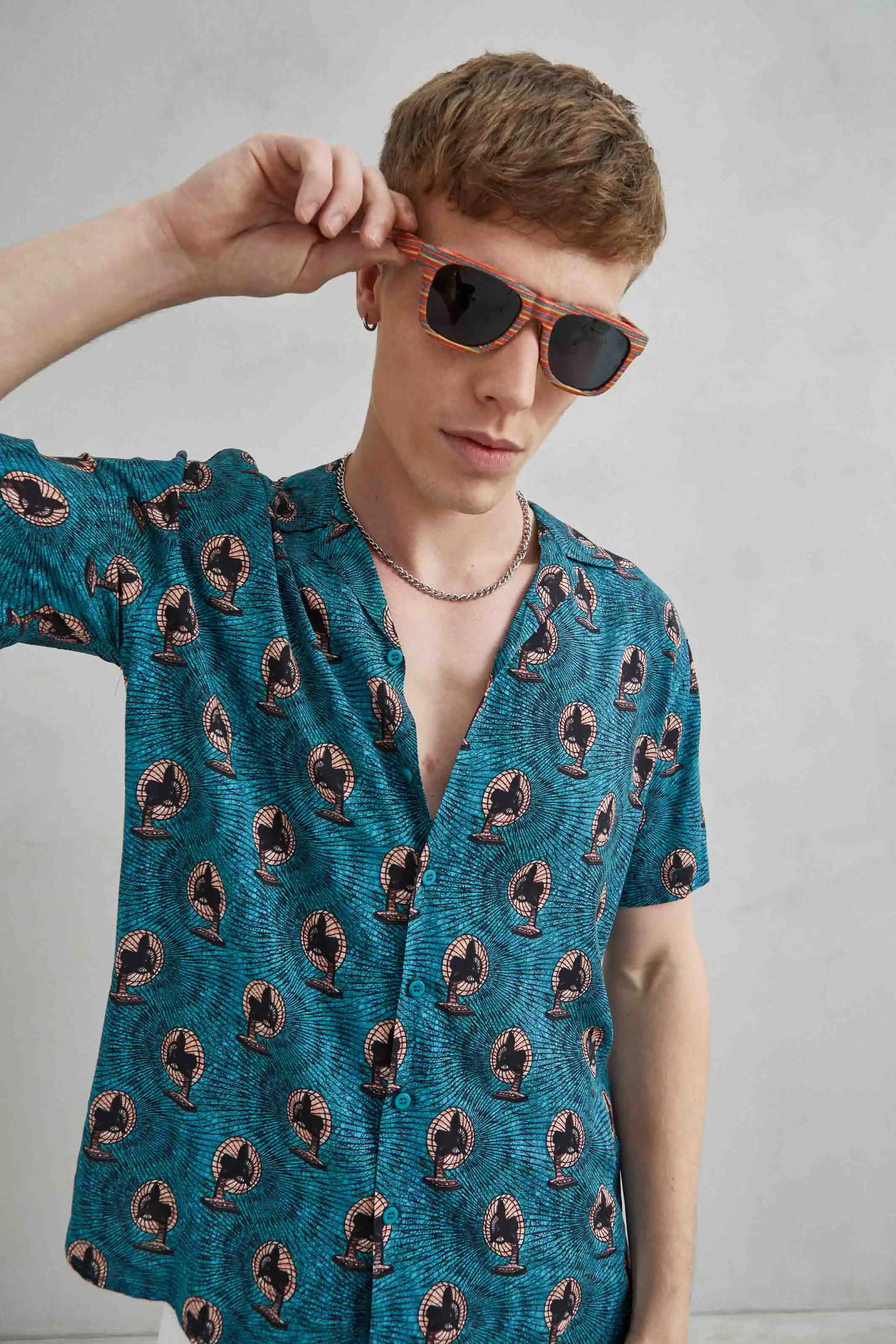 Imperio Vintage Retro Hawaiian Shirt Men Summer Breathable Printed Short Sleeve Fan Print Turquoise Blue 100% Cotton Casual