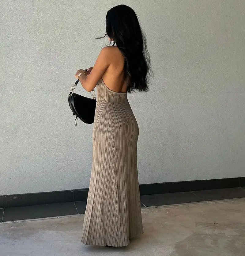 Knitted Backless Maxi Dress for Women Summer Sleeveless Holiday Party Sexy Halter Bodycon Long Dresses