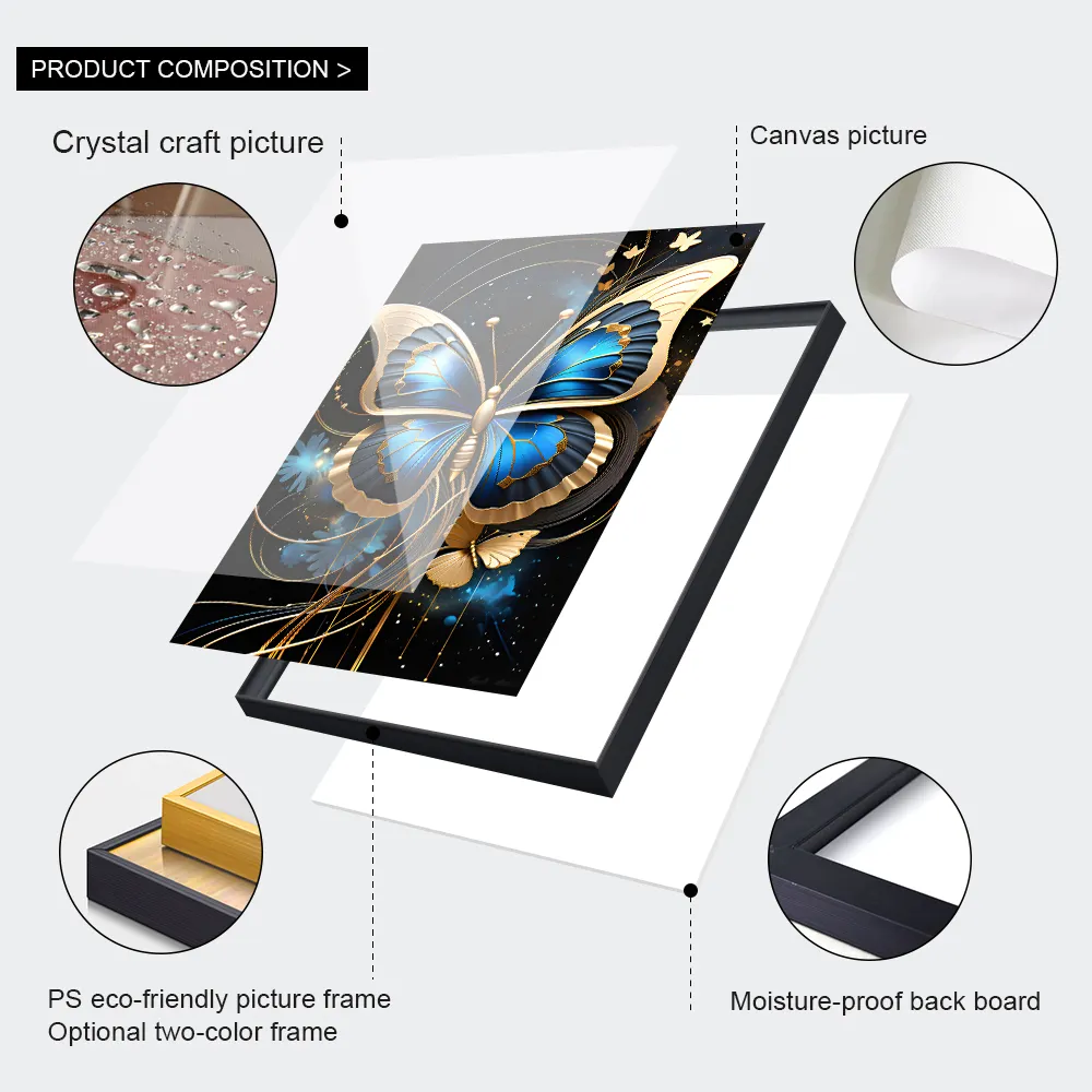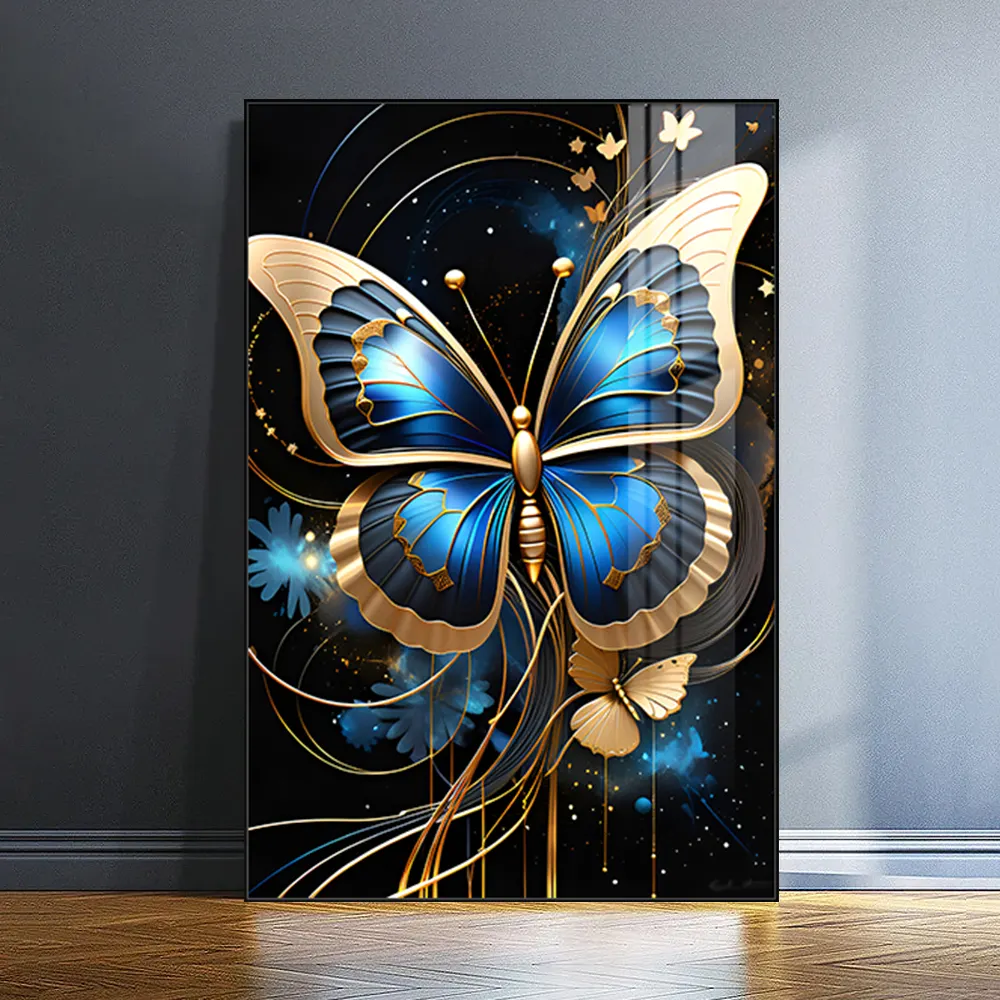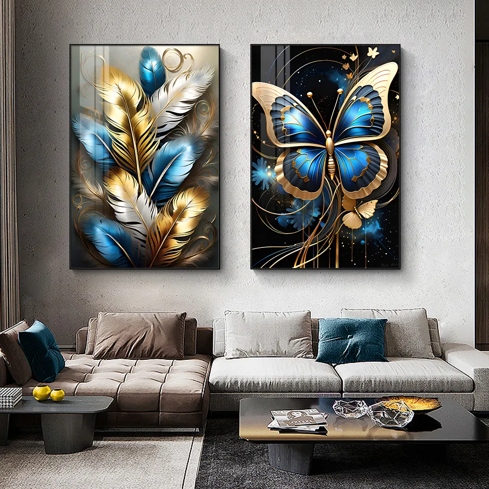 Luxury 3 PCS Set High Quality Golden Butterfly Animal Crystal Porcelain Prints Wall Art Painting for Living Room Home Decor