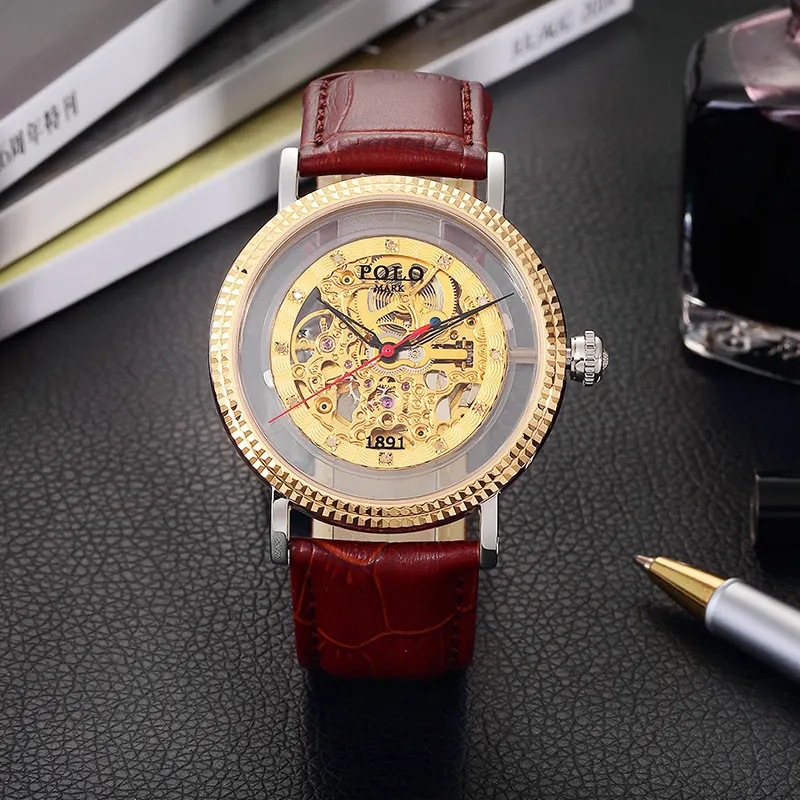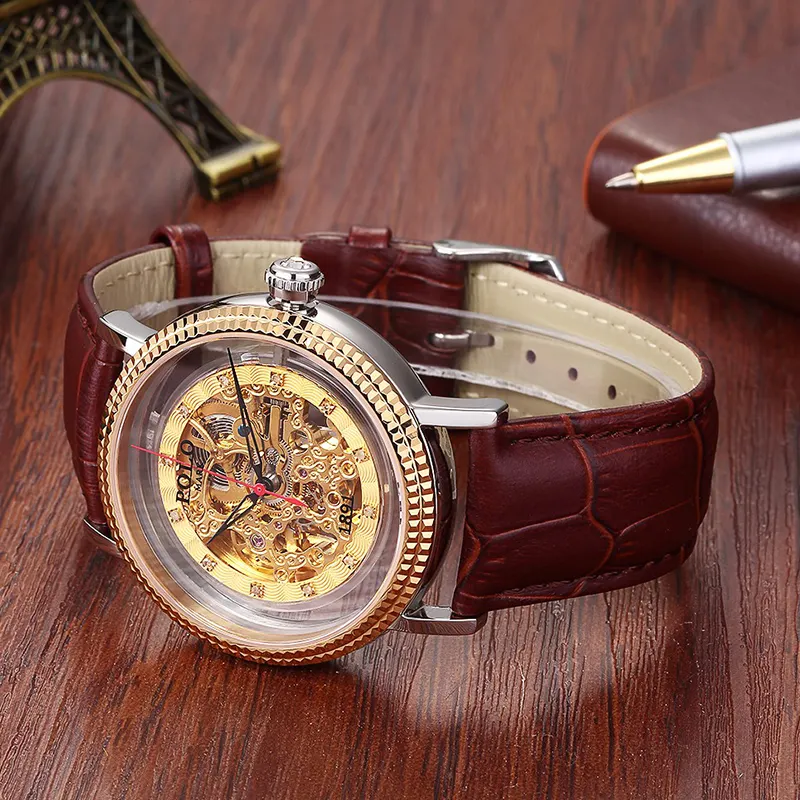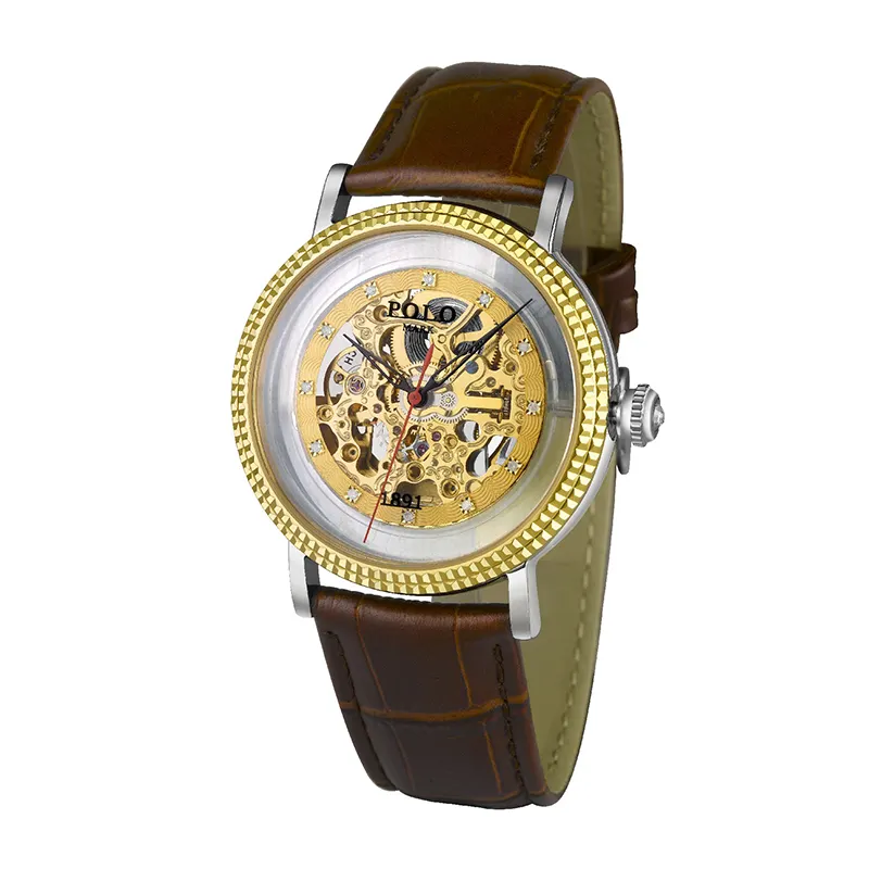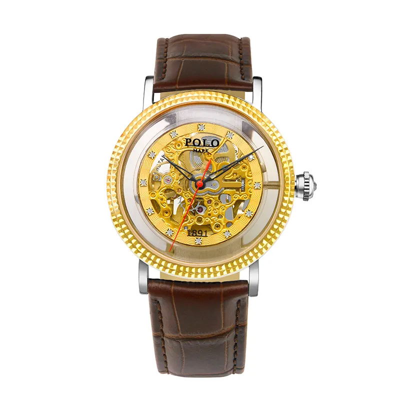Luxury Men's Stainless Steel Mechanical Watch with Unique Hollow Out Design and Transparent Case Back Gold Tone