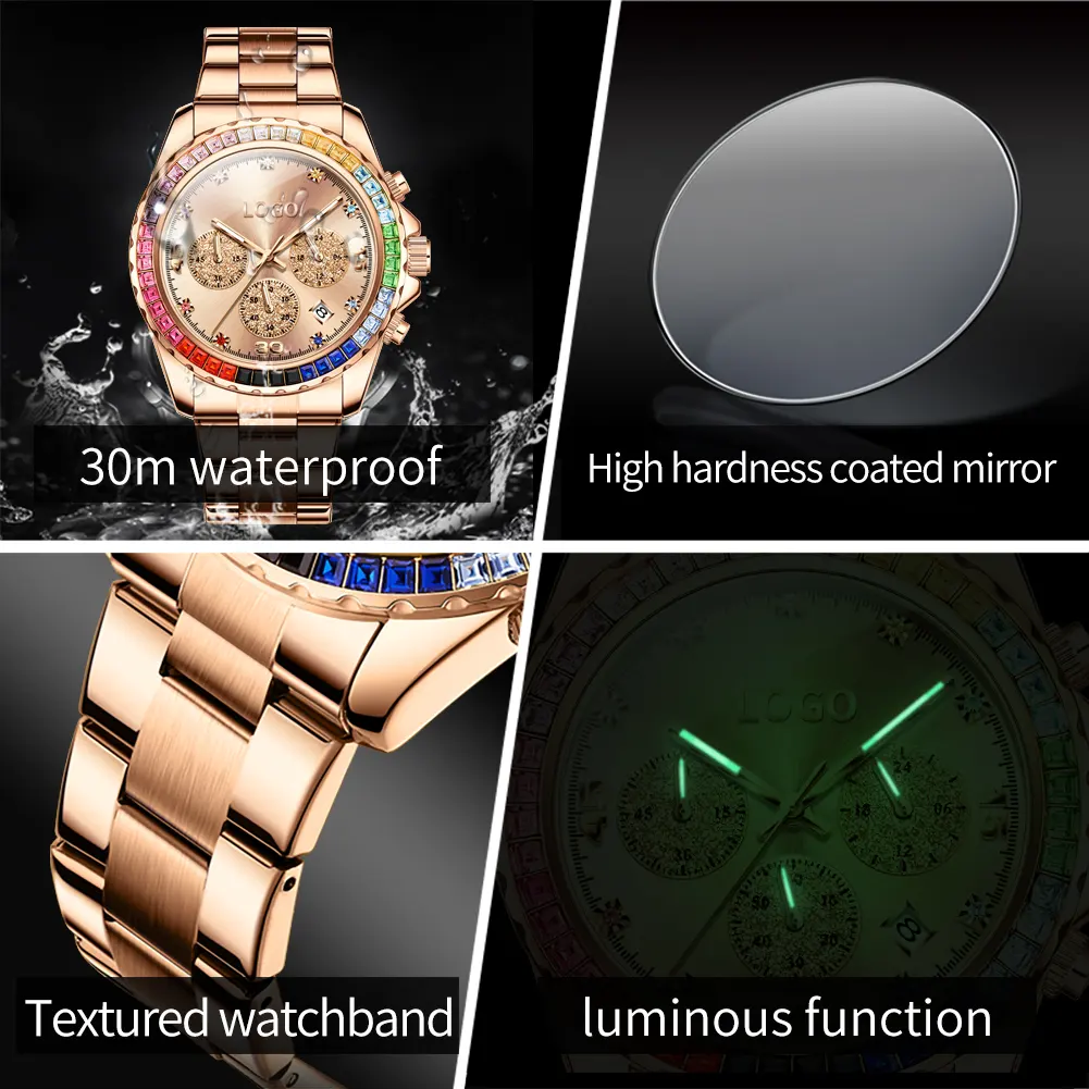 OEM 2939 Custom logo Stainless Steel Multifunctional Fashion Sports Watch Diamond Waterproof Quartz Watch for Man