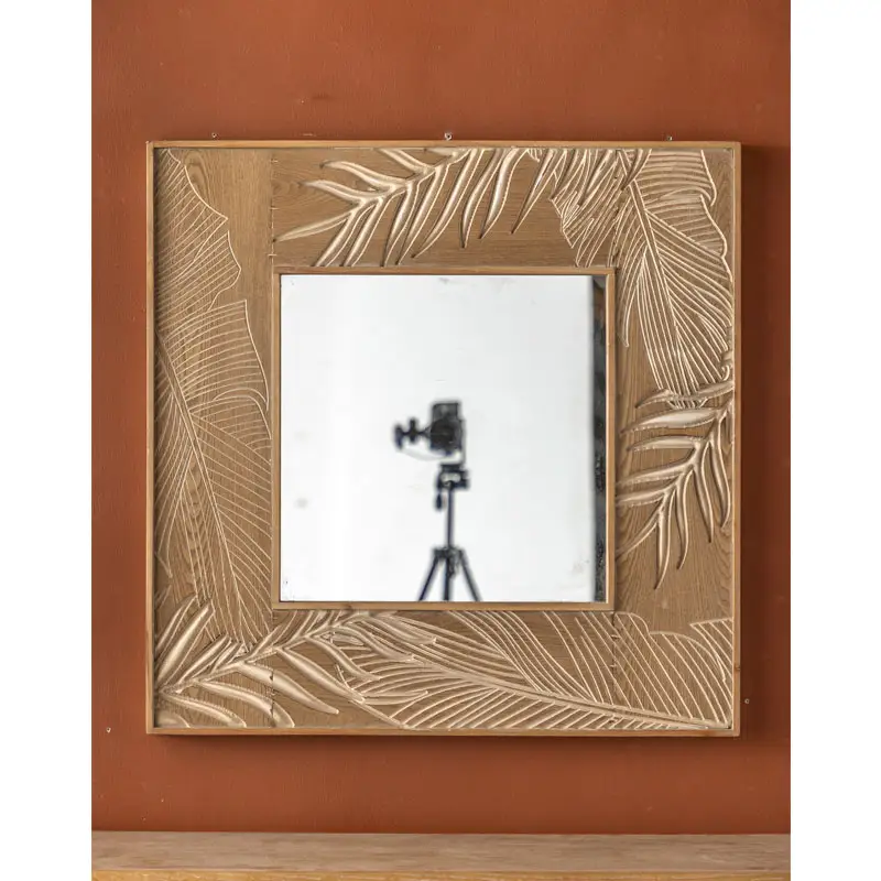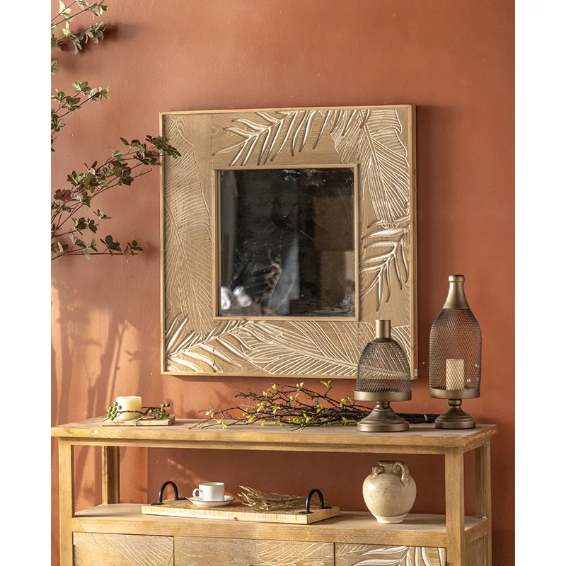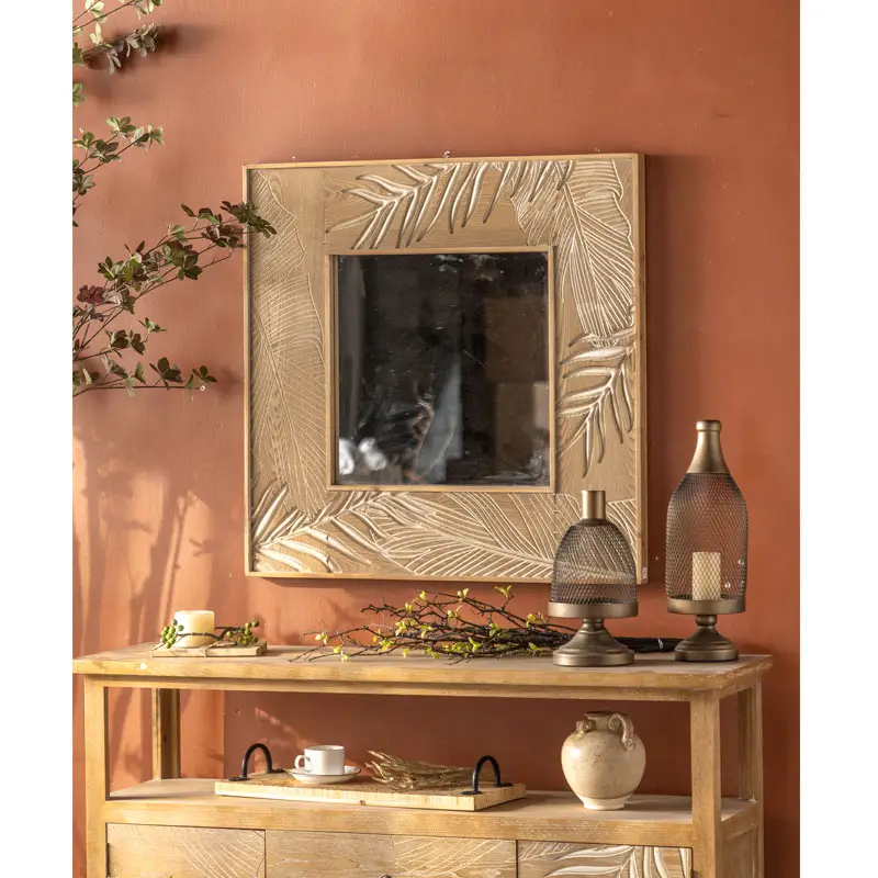 Rustic Simple Carve Wood Art Decorative Wall Mirror for Home Decor and Living Room Hanging Design Farmhouse