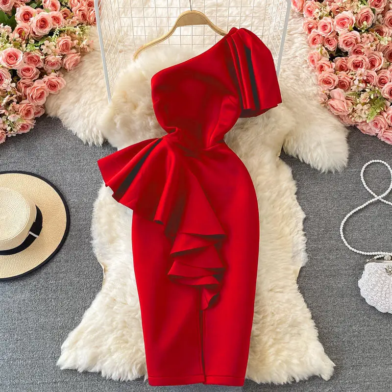 Summer Trending Casual Ruched Bodycon One Shoulder Luxury Women Elegant Dresses With Slit