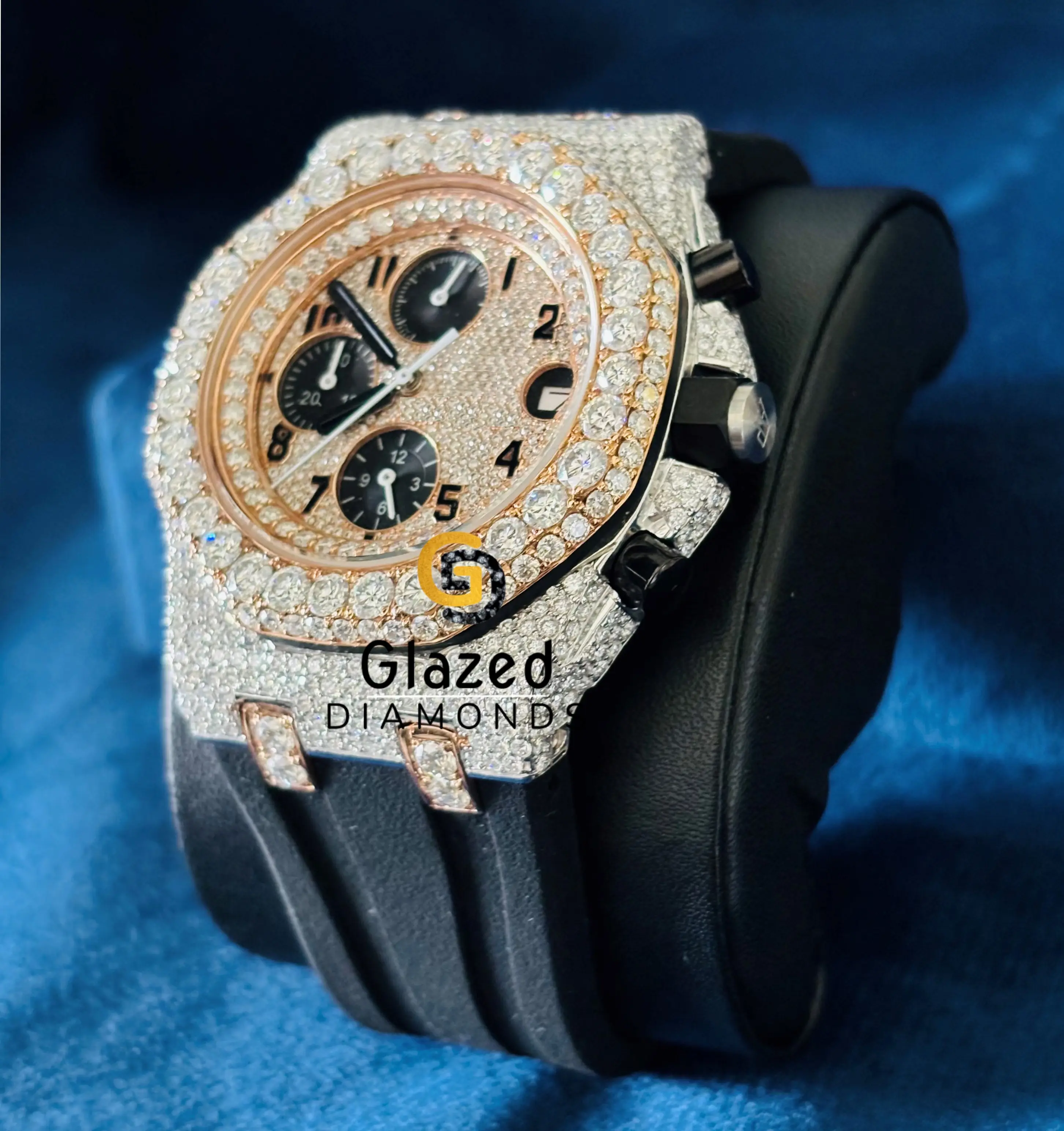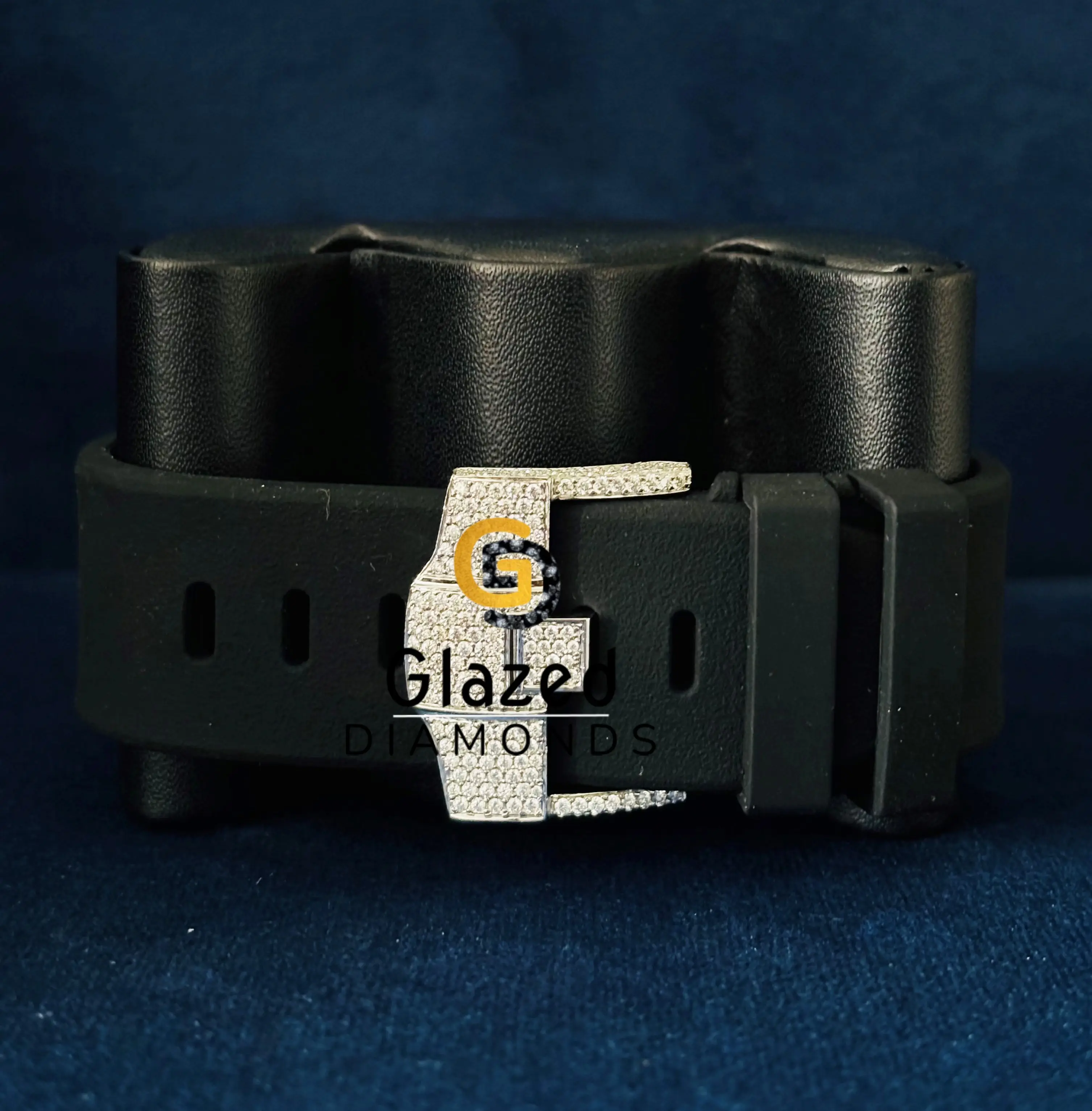 Trendy Dual Tone Hip Hop Chronograph Moissanite Watch Face Dial Iced Out With Round Brilliant Cut Diamond in Black Rubber Band
