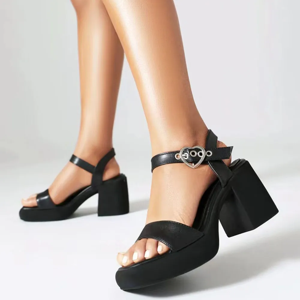 Trendy Ladies Open Toe Sandals Chunky Heel Heart Buckle Fashionable Straps Summer Parties Rubber PU Insole Upper Platform Design