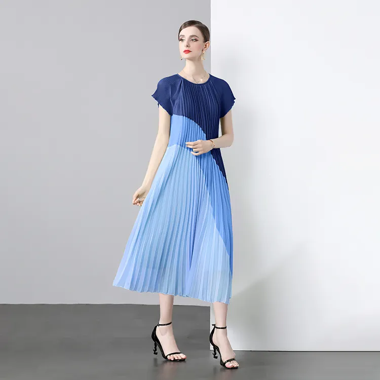 Women Clothing Dress Summer Vintage O-Neck Slim Pleated Midi Dress for Women Short Sleeve Empire Shift Lace Dress Purple Yellow