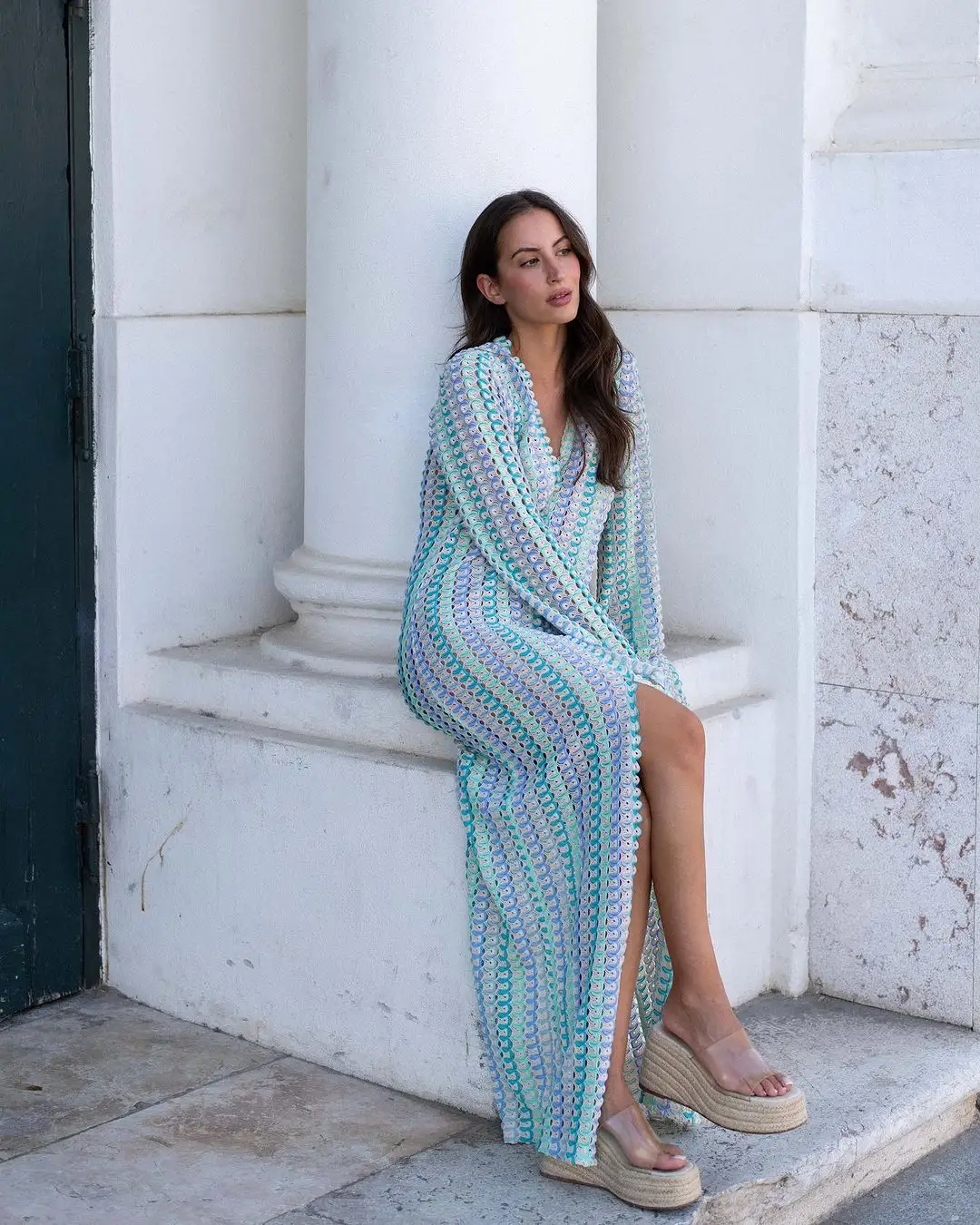 Women Knit Split Flare Sleeved Maxi Dress Elegant Fashion Sexy Deep-V Hooked Crochet Robes Female Club Party Vacation Vestidos