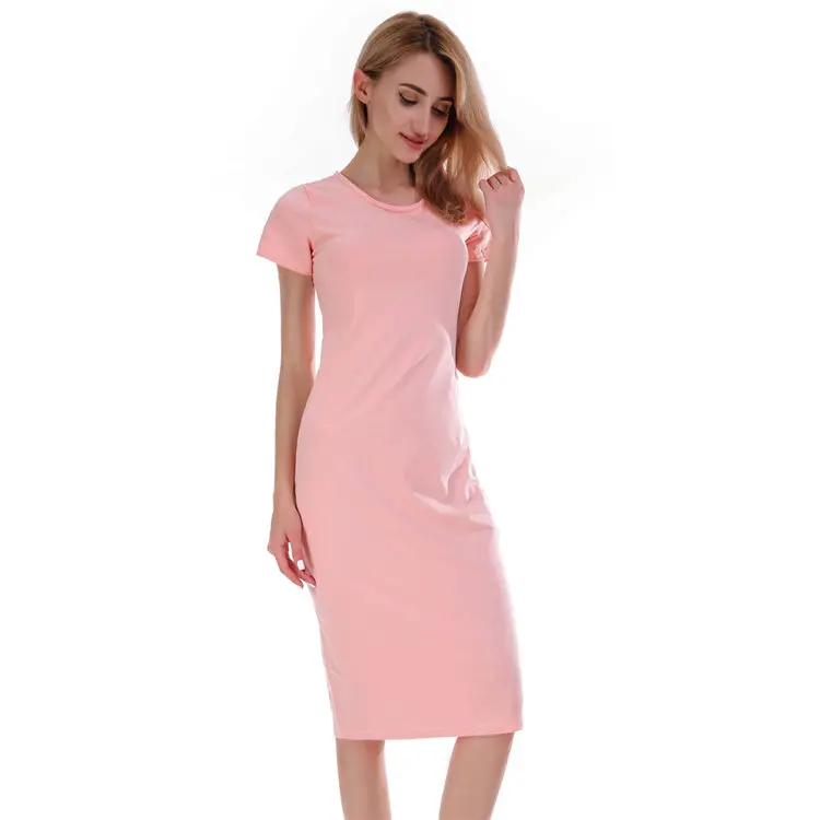 Women Round Neck Short-sleeved 100% Cotton Long Dress Ladies Casual Plain Summer Plus Size t Shirt Dresses