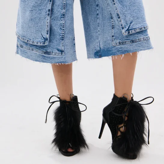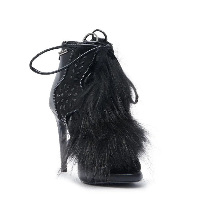 Women's Black Faux Fox Fur Peep Toe Stiletto Heel Ankle Sandals Lace-Up Design Punk Style Sandals For Women